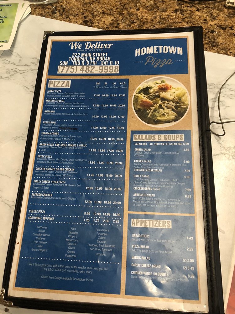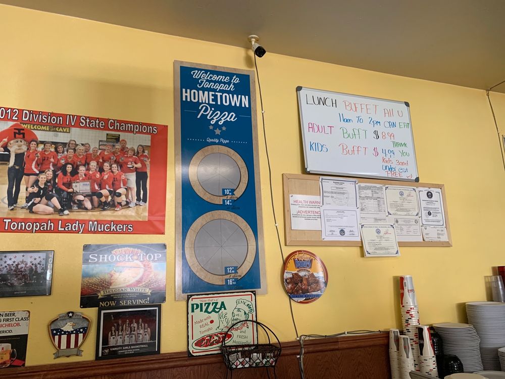 Introducing Hometown Pizza, a pizza joint located in Tonopah, NV, offering a variety of mouth-watering pizza options like 6 Meat Pizza and Chicken Bacon Ranch Pizza. The menu also includes appetizing salads such as Antipasto and Caesar Salad, as well as tempting appetizers like Garlic Cheese Bread and Chicken Wings. Customers rave about the fresh salads, delicious pizza, and friendly service. Highlights include a lunch buffet with a great selection of pizza and a salad bar, perfect for a quick stop on a long drive. The crust is praised for being nice and crisp, and the Tonopah pizza with olives is a must-try. While closed on Wednesdays, Hometown Pizza is the go-to spot for a satisfying meal in town.